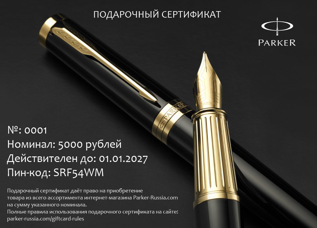 Электронный сертификат гибкого номинала от официального дилера Parker в Барнауле. Вы можете дополнительно заказать гравировку, которая подчеркнет Вашу оригинальность и придаст памятность статусному подарку. Все ручки Паркер поставляются в фирменном футляре.